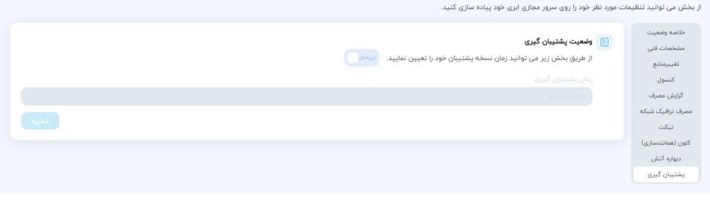 میتوانید در این بخش دورههای پشتیبان گیری را به صورت روزانه، هفتگی یا ماهانه تعیین کنید و در بخش لیست نسخههای پشتیبان، پشتیبانهای شما قابل دسترسی هستند. برای انجام این عملیات ابتدا وضعیت پشتیبانگیری را فعال کنید.