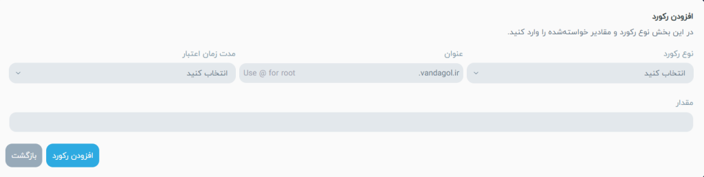 برای تعریف رکورد جدید بر گزینهی افزودن رکورد کلیک کنید. در پنجرهی بازشده مقادیر مورد نظر را وارد کرده و بر گزینهی «افزودن رکورد» کلیک کنید.