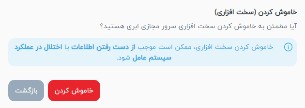 خاموش سختافزاری: با انتخاب این گزینه از بخش عملیات، میتوانید سرور ابری خود را بهصورت سختافزاری خاموش کنید. این عملیات ممکن است باعث از بینرفتن اطلاعات یا اختلال در عملکرد سیستم عامل شود. پس از تایید دوبارهی گزینهی خاموش کردن در پنجره زیر، سرور شما به صورت سختافزاری خاموش خواهد شد.
