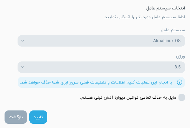 بازسازی: عملیاتی است که در آن میتوانید سرور ابری خود را که در حال حاضر از آن استفاده میکنید، دوباره بسازید. برای بازسازی، از منوی عملیات، بر گزینهی بازسازی کلیک کنید. سپس در پنجرهی که برای شما نشاندادهمیشود، سیستم عامل و نسخهی آن را انتخاب کنید. در صورتی که میخواهید قوانین دیوارهی آتشین قبلی را حذف کنید، گزینهی مربوط به آن را انتخاب کرده و تایید کنید.
