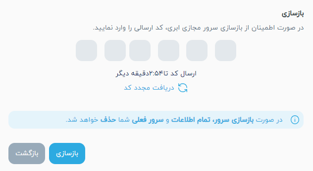 سپس کد ارسالی به تلفن همراه یا ایمیل خود را وارد کنید. توجه داشته باشید که با انجام این عملیات تمام اطلاعات و سرور فعلی شما حذف خواهد شد.