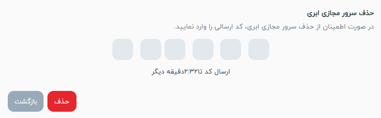 حذف: این دسترسی به شما اجازه میدهد که سرور ابری خود را کاملا حذف کنید. پس از انتخاب این گزینه از منوی عملیات، یک کد به تلفن همراه یا ایمیل شما ارسال میشود که باید آن را در پنجره، به شکل زیر وارد کرده و حذف را تایید کنید.