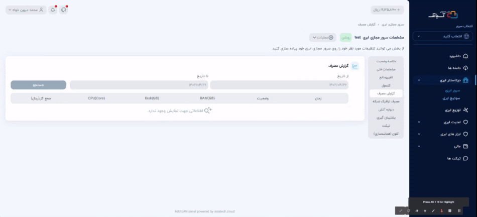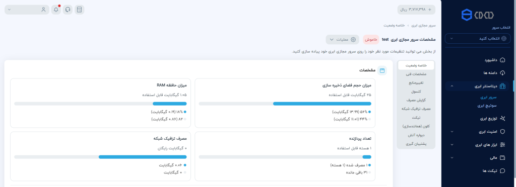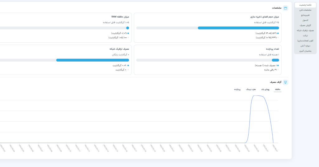 با انتخاب خلاصه وضعیت از منوی سمت راست، مشخصات کامل میزان مصرف شما از منابع سرور ابری نمایش داده میشود و میتوانید از میزان مصرف منابع خود آگاهی داشته باشید و گراف مصرف هر یک از منابع برای شما نمایشدادهمیشود.