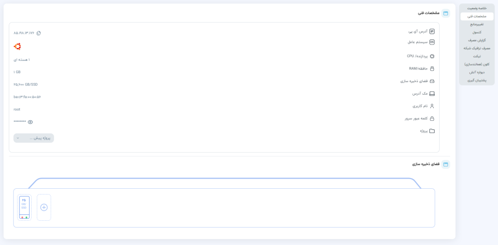 در بخش مشخصات فنی، اطلاعات فنی شما مانند آدرس آیپی، نوع سیستم عامل، CPU، RAM، فضای ذخیرهسازی، مک آدرس، نام کاربری و کلمه عبور قابل مشاهده خواهد بود. در قسمت فضای ذخیرهسازی، امکان اضافه کردن و یا حذف هارد دیسک برای شما فراهم شده است.
