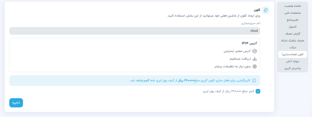 همانندسازی یا کلونکردن سرور ابری به این معنا است که سرور شما با همان مشخصات و منابع، تکثیر و همانند سازی میشود. شما میتوانید با تخصیص یک نام برای سرور جدید خود و پذیرفتن هزینهی پرداختی و سپس با کلیک کردن بر دکمهی ذخیره، سرور خود را همانندسازی کنید.