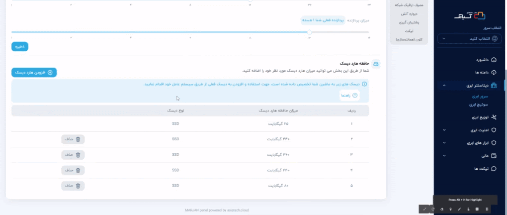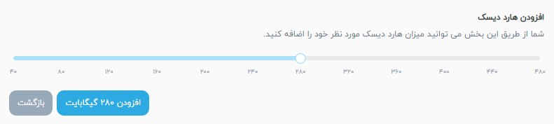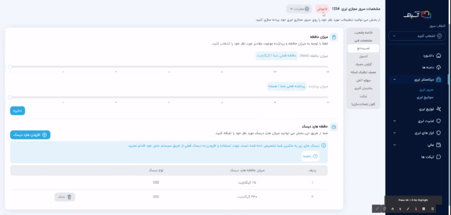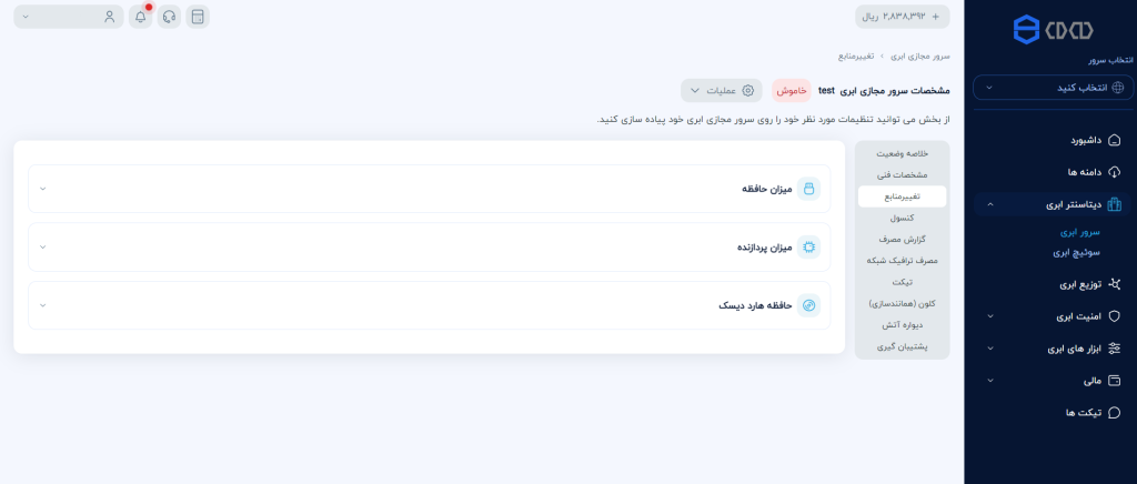 در این بخش میتوانید میزان رم، میزان پردازنده و هارد دیسک را تغییر دهید. برای این کار پس از اطمینان از خاموشی سرور امکان تغییر منابع برا شما فعال میشود. برای انجام این عملیات ابتدا منبع مورد نظر خود را انتخاب کنید.