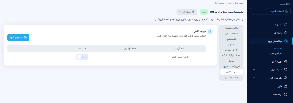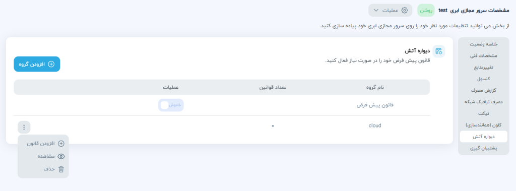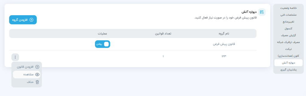 در این بخش قوانین دیوارهی آتشین را تعیین میکنید. با انتخاب گزینه افزودن گروه، یک نام برای گروه تعریف کنید.