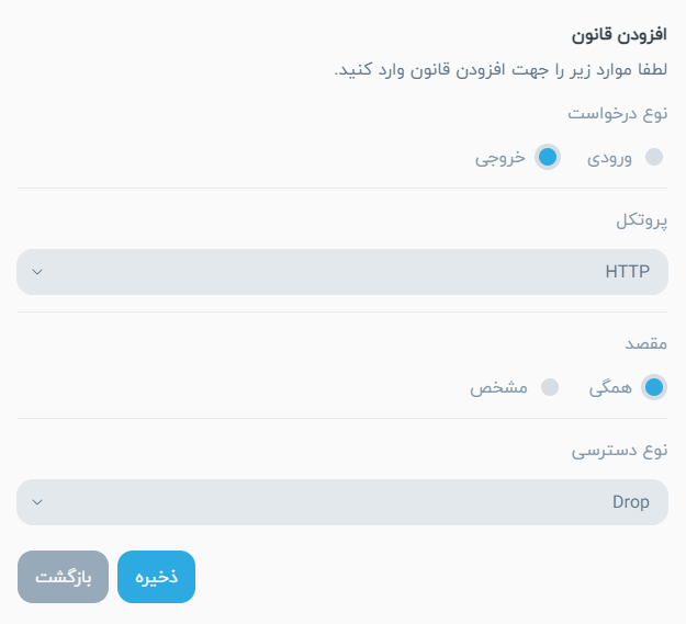 در صفحه جدید میتوانید نوع درخواست، پروتکل، مبدا، آی پی و نوع دسترسی را مشخص کنید.