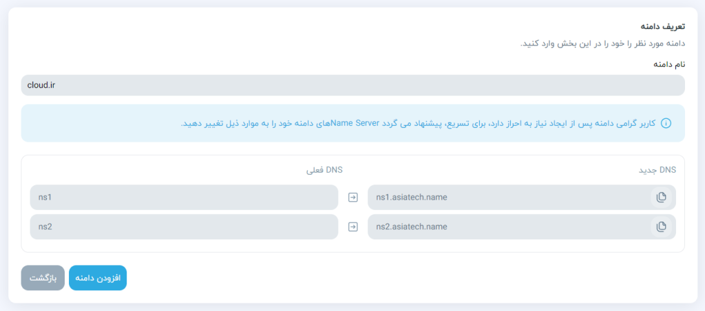 پس از اعمال احراز مالکیت، امکان مدیریت DNS برای شما فعال میشود. با کلیک بر دکمهی بازگشت به صفحه مدیریت دامنهها منتقل شوید.
