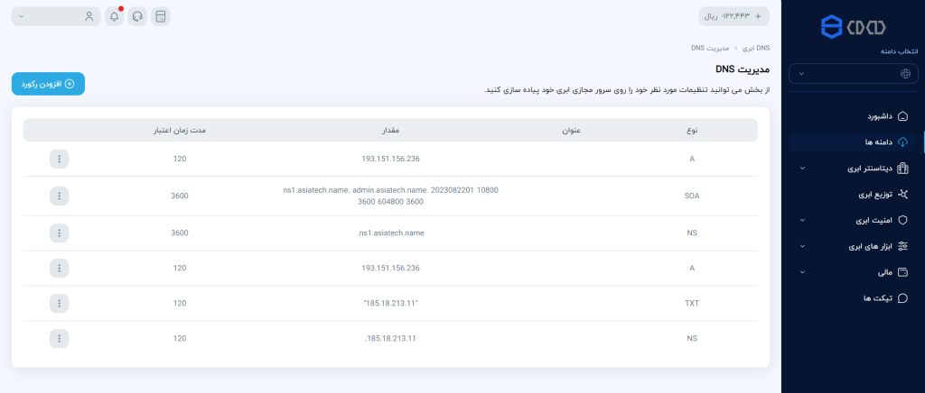 با کلیک بر دکمهی «مدیریت DNS» به صفحهی مدیریت رکوردهای DNS منتقل خواهید شد.