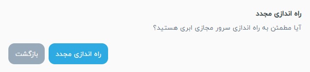 راهاندازی مجدد: زمانی که به هر دلیلی نیاز به راهاندازی دوباره سرور خود دارید، از این گزینه استفاده کنید. سرور شما بهصورت نرم افزاری دوباره راهاندازی میشود. پس از انتخاب گزینه راهاندازی مجدد از منوی عملیات، در پنجره جدید گزینهی راهاندازی مجدد را تایید کنید.