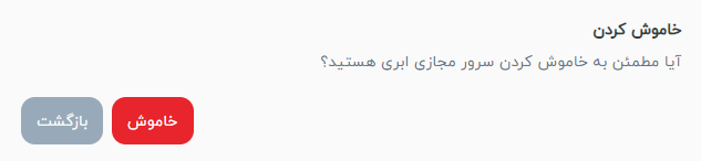 خاموش/ روشن: برای خاموش و روشن کردن نرمافزاری سرور خود میتوانید از این عملیات استفاده کنید. در صورتی که میخواهید سرور خود را خاموش کنید ابتدا بر گزینهی خاموش در بخش عملیات کلیک کرده و سپس در پنجره زیر با انتخاب گزینهی خاموش، سرور ابری خود را غیرفعال کنید.