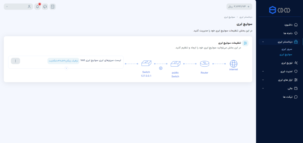 برای مدیریت سوئیچهای ابری خود از منوی سمت راست، بر گزینهی دیتاسنتر ابری، سوئیچ ابری کلیک کنید.