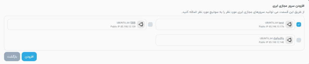 با کلیک بر روی کادر بالا، لیست سروهای ابری برای شما بارگذاری شود. هر تعداد سروری که میخواهید را میتوانید برای اضافه شدن به سوئیچ انتخاب کنید. پس از انتخاب سرورها، گزینهی افزودن را انتخاب کنید.