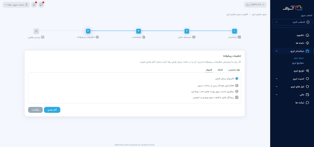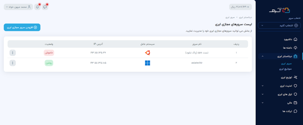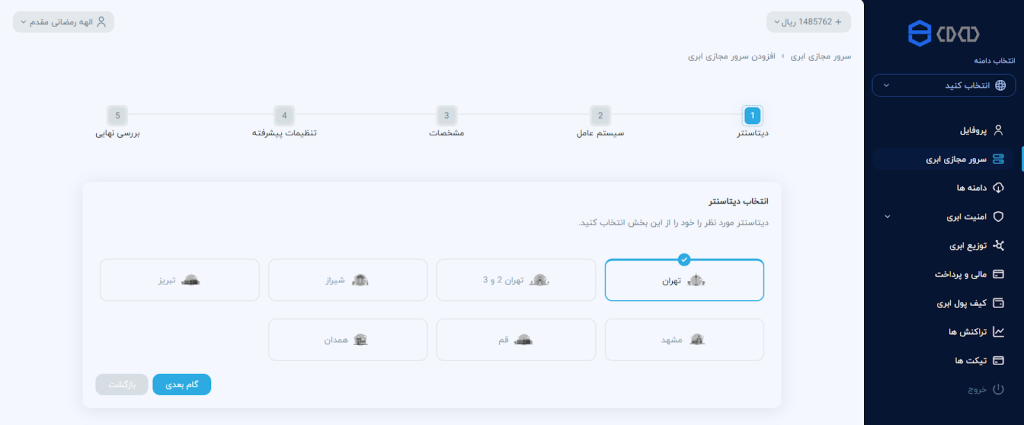 برای ساخت سرور ابری در کلود، از منوی سمت راست گزینه دیتاسنتر ابری را انتخاب کرده و سپس بر روی گزینه سرور ابری کلیک کنید.