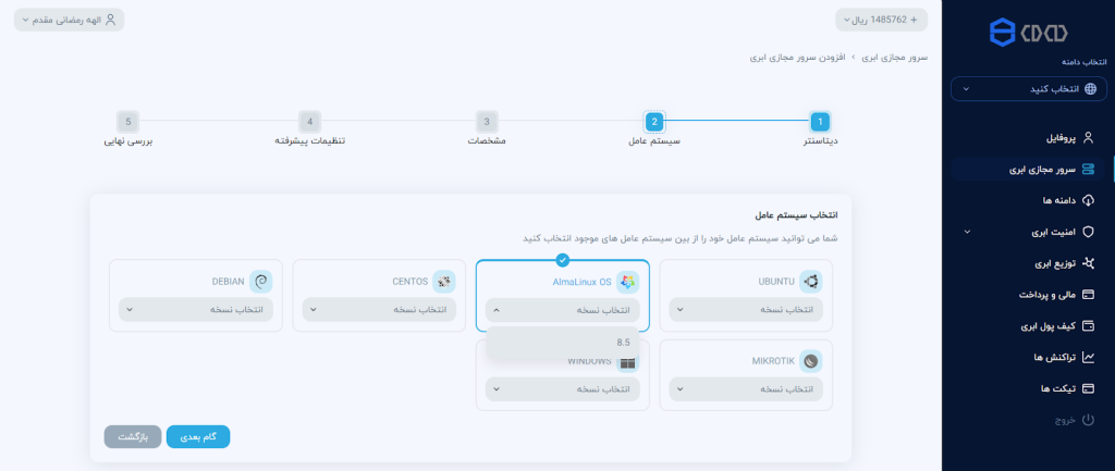 در این بخش از میان سیستم عاملهای ارائهشدهی کلود، سیستم عامل دلخواه و نسخهی آن را انتخاب کنید.