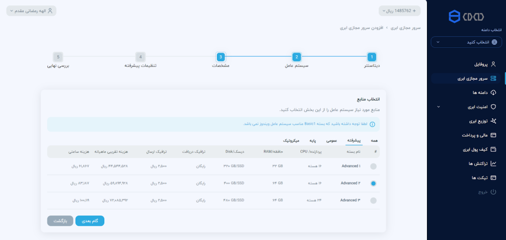 در صفحهی جدید میتوانید منابع مورد نیاز سرور مجازی ابری را تعیین کنید. شما میتوانید از بستههای پیشرفته، عمومی و پایه cloud.ir با منابع مختلف استفاده کنید. اطلاعات منابع هر یک از بستهها در این صفحه قابل مشاهده است.