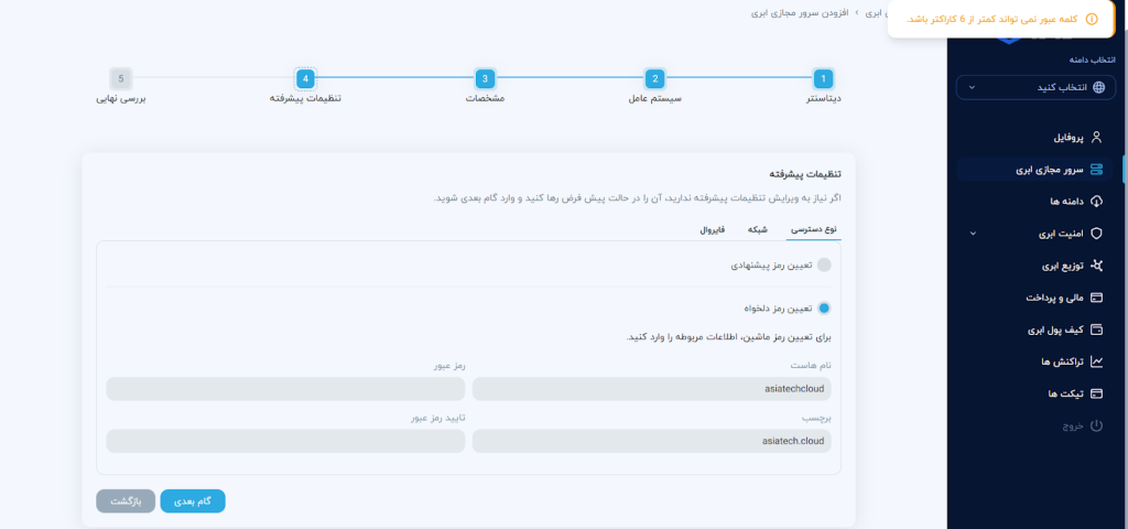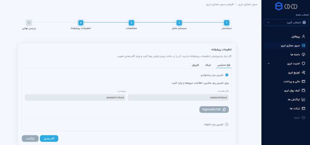 نوع دسترسی: در این بخش میتوانید نوع رمز خود را تعیین کنید. با انتخاب تعیین رمز تصادفی پس از درج نام هاست و برچسب آن و کلیک بر گزینهی ایجاد کلمهی پیشنهادی، سیستم یک رمز تصادفی را برای شما تولید خواهد کرد. با کلیک بر روی رمز به صورت خودکار کپی خواهد شد.