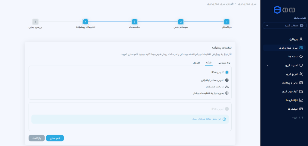 شبکه: در این بخش میتوانید نسخهی IP مورد استفاده جهت اتصال به سرور مجازی ابری را انتخاب کنید.